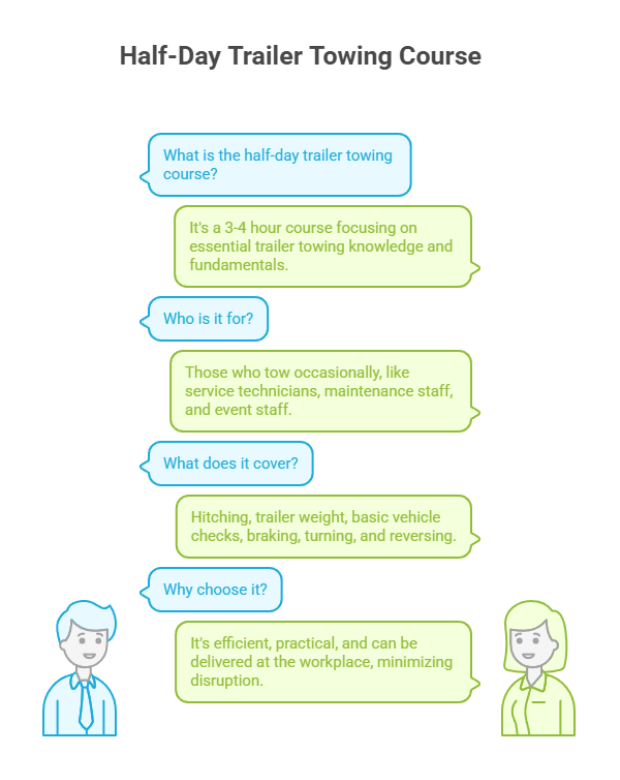 What’s Discussed in the Article? Choosing between a half-day and full-day trailer towing course depends on how often your team tows and their level of experience. While half-day training covers the essentials, a full-day towing course provides extensive learning and practicals for more complex towing tasks.